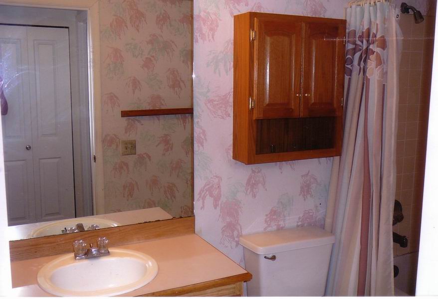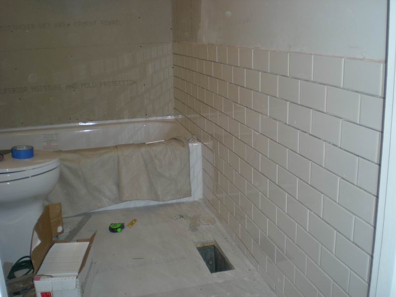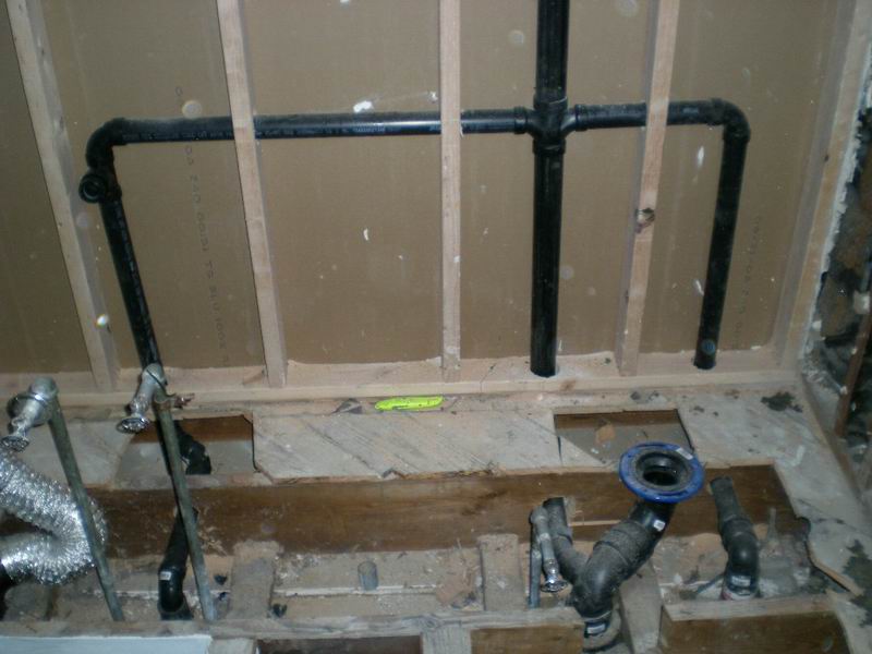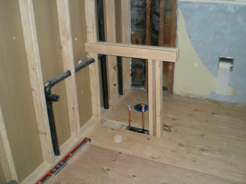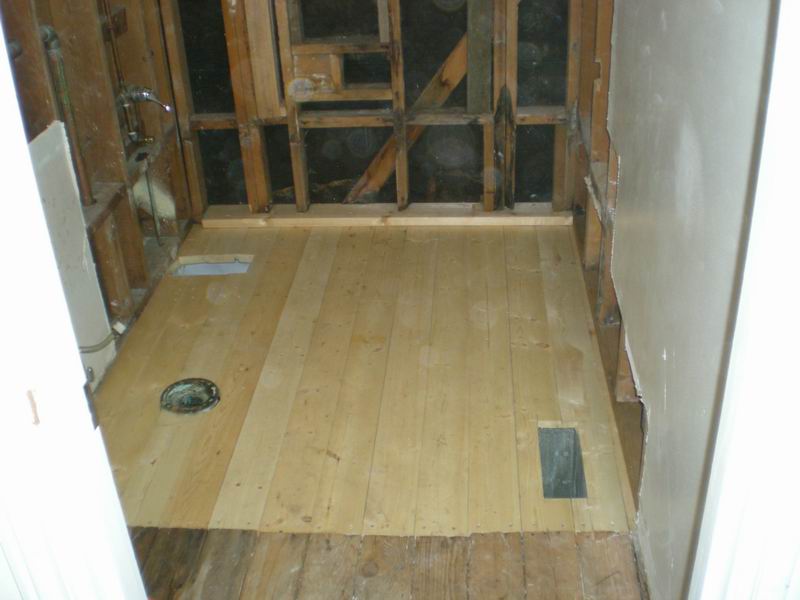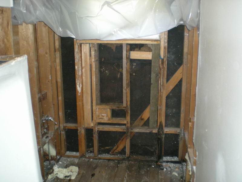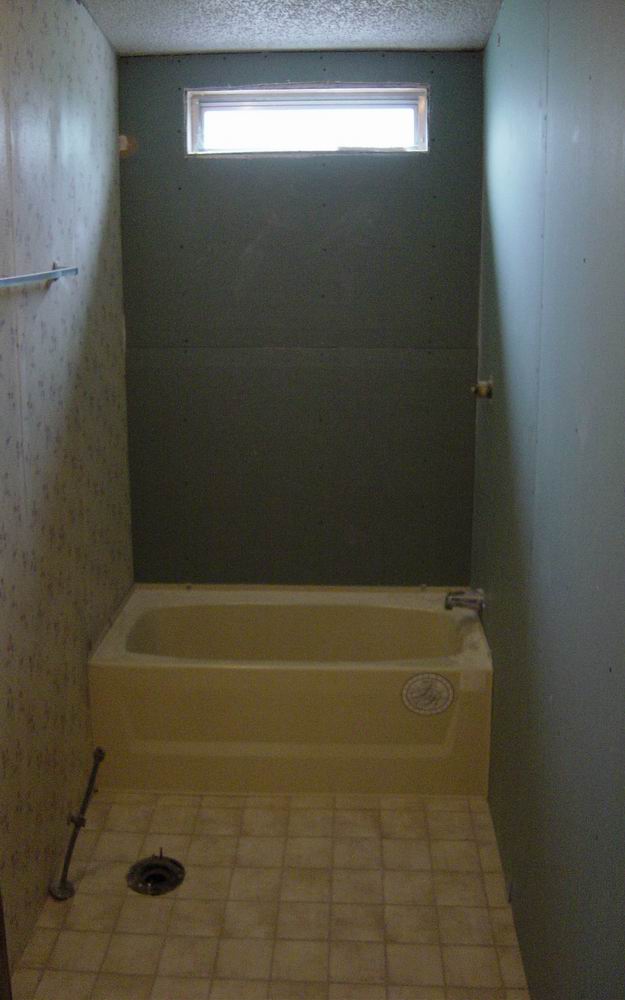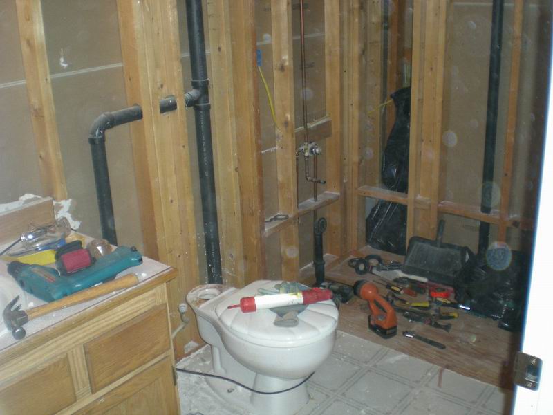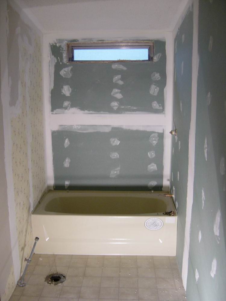 Our first bathroom here was too small for the owner. We moved the back wall 18 inches for more room. There were also some repairs needed which were done before the remodel