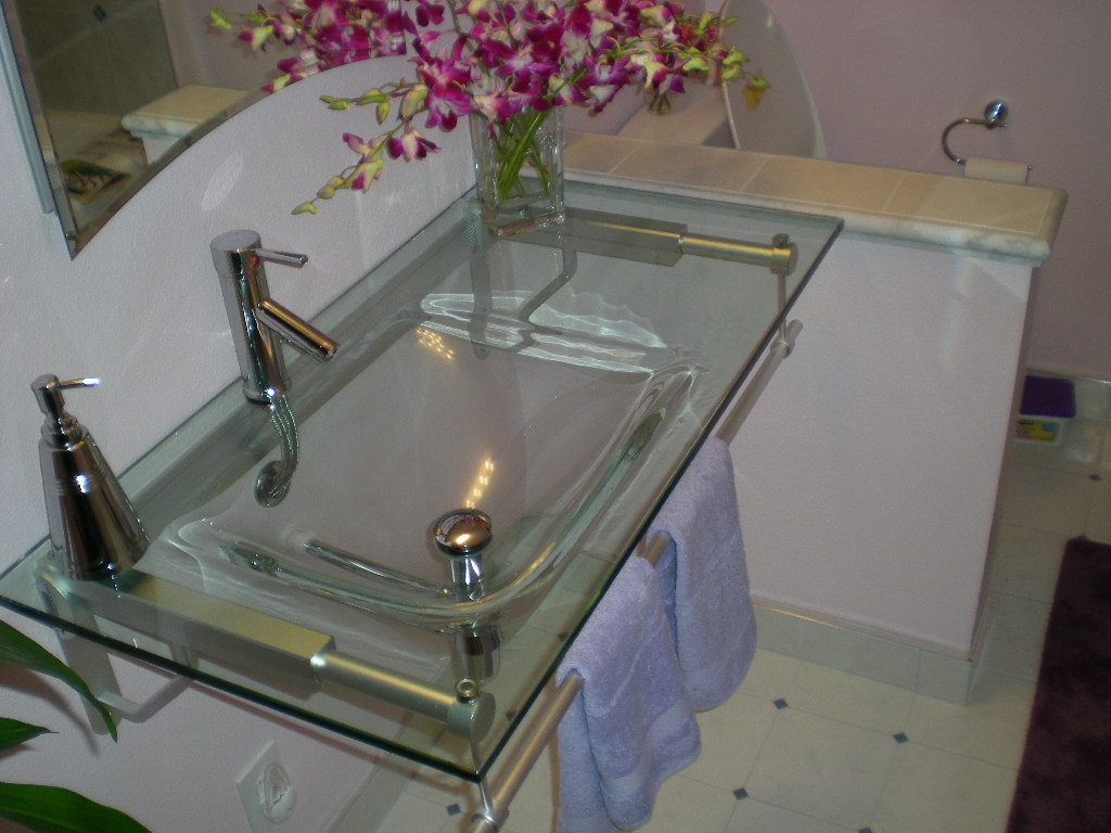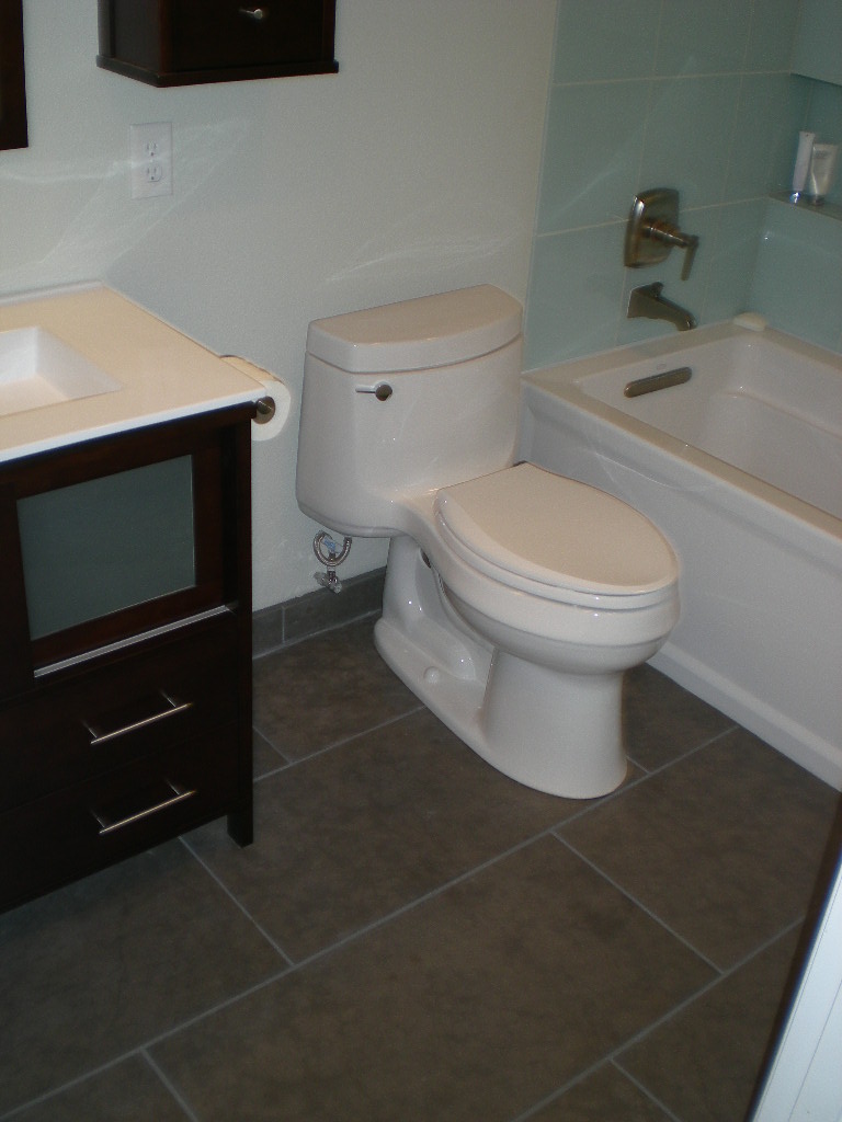 This bathroom just needed updating. Glass tile surround and slate tile flooring.
