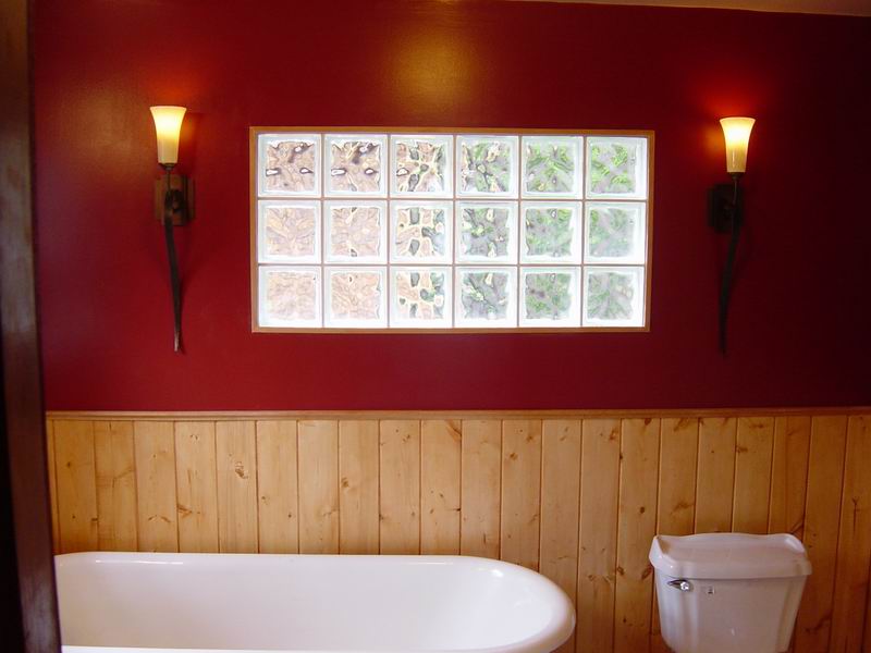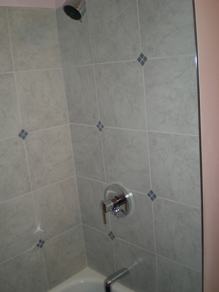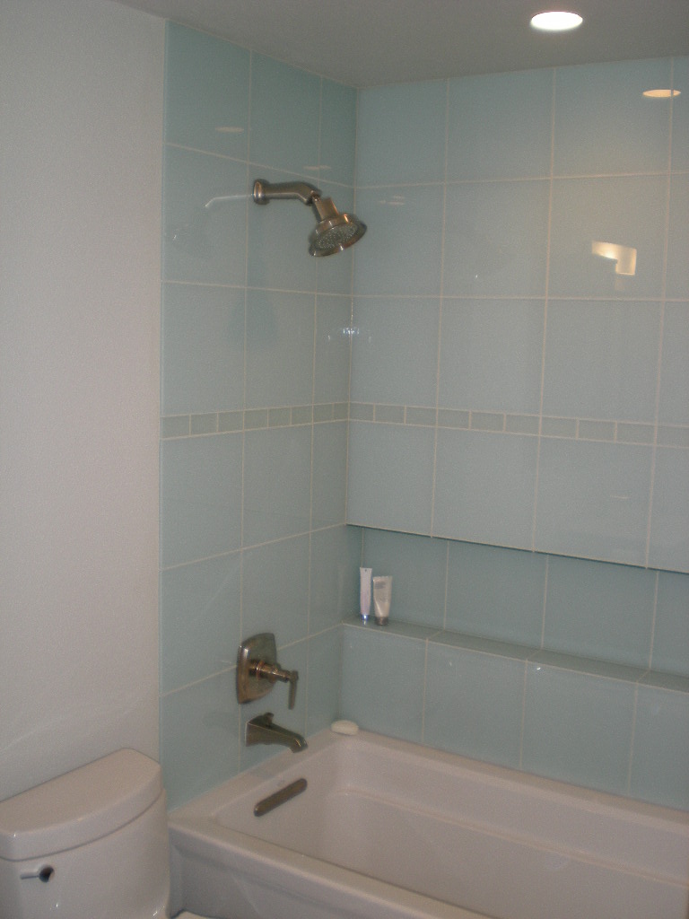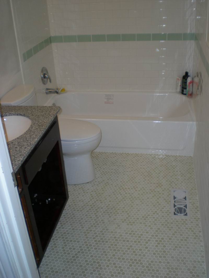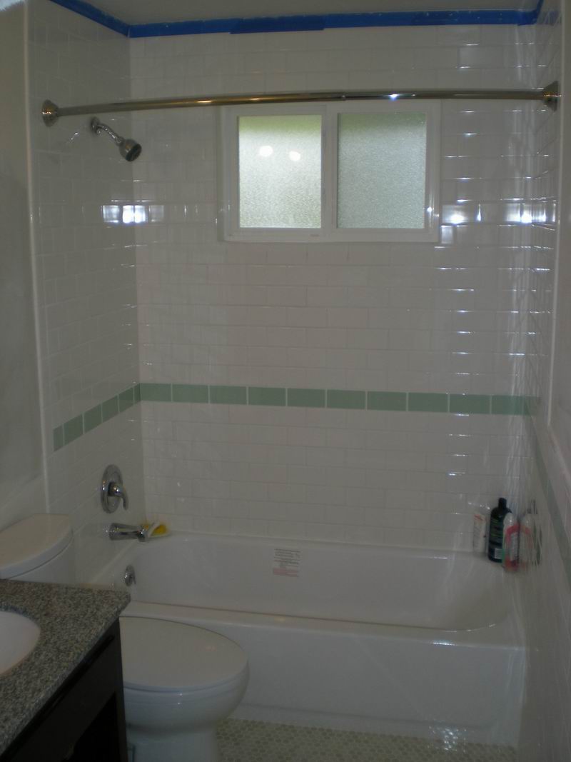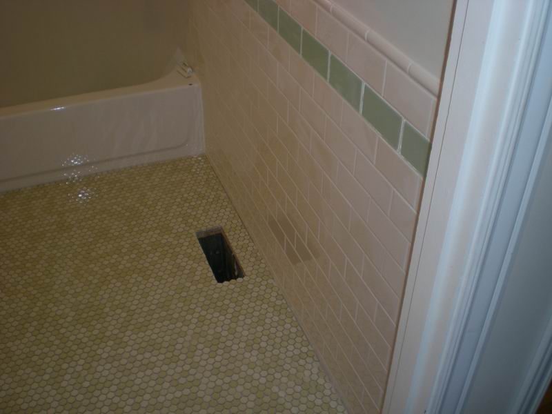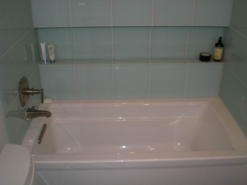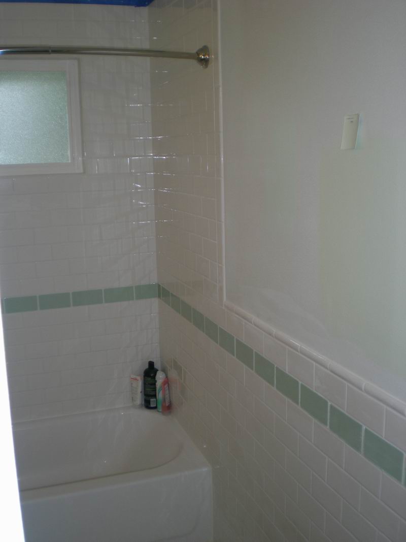 This bathroom had water damage under the corners of the tub.  Owner also wanted a tile shower surround with green glass tile inlay.