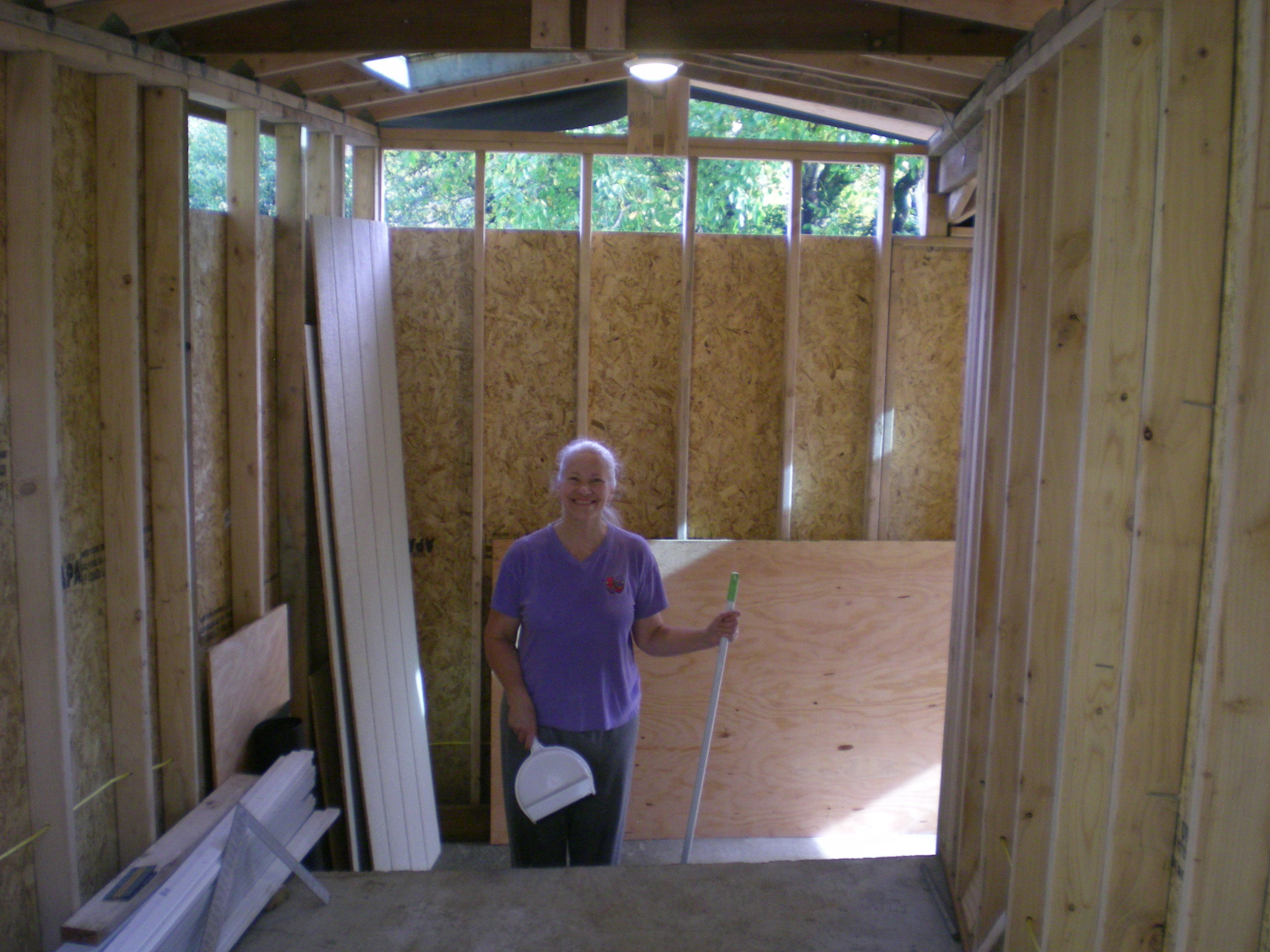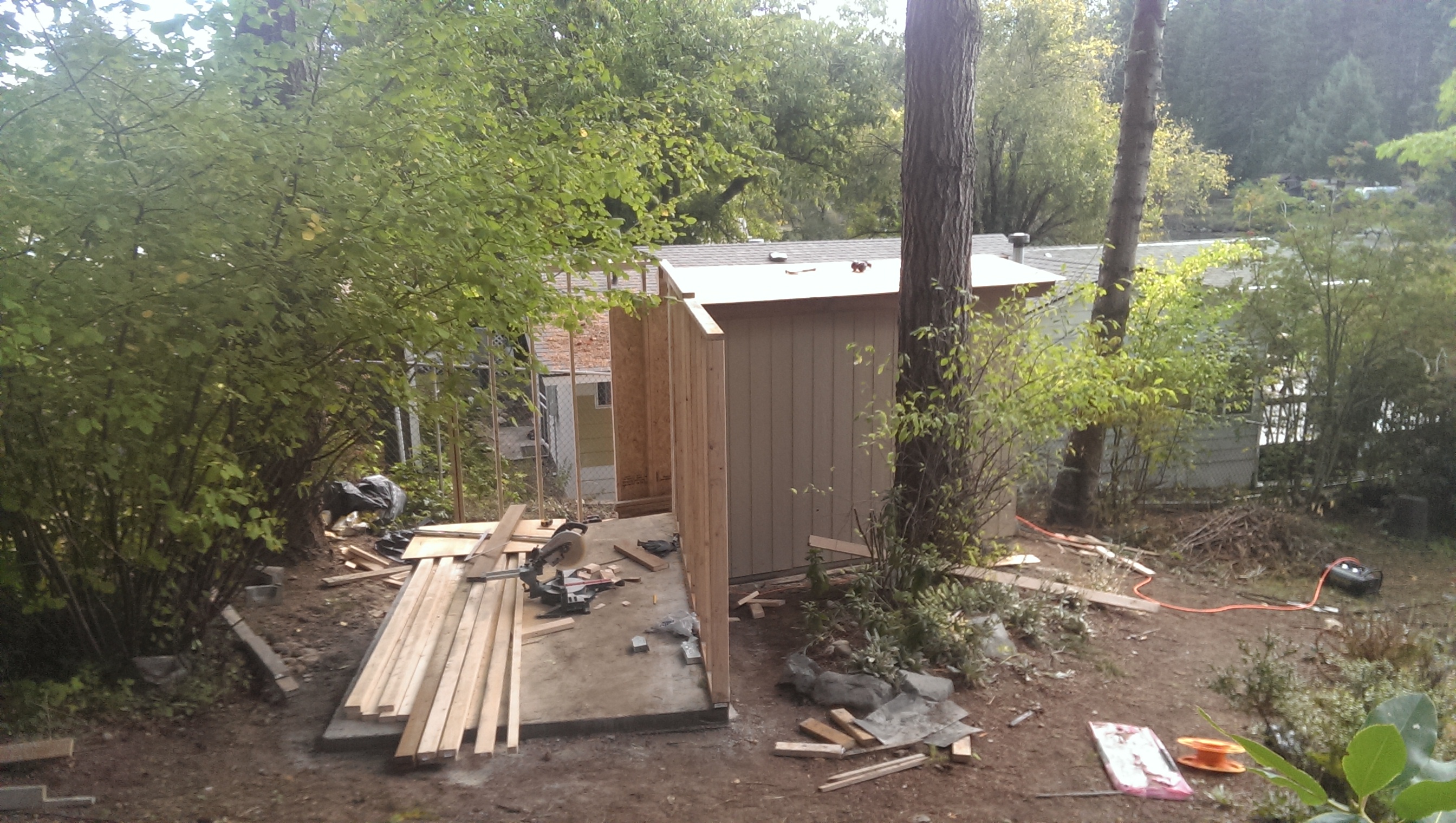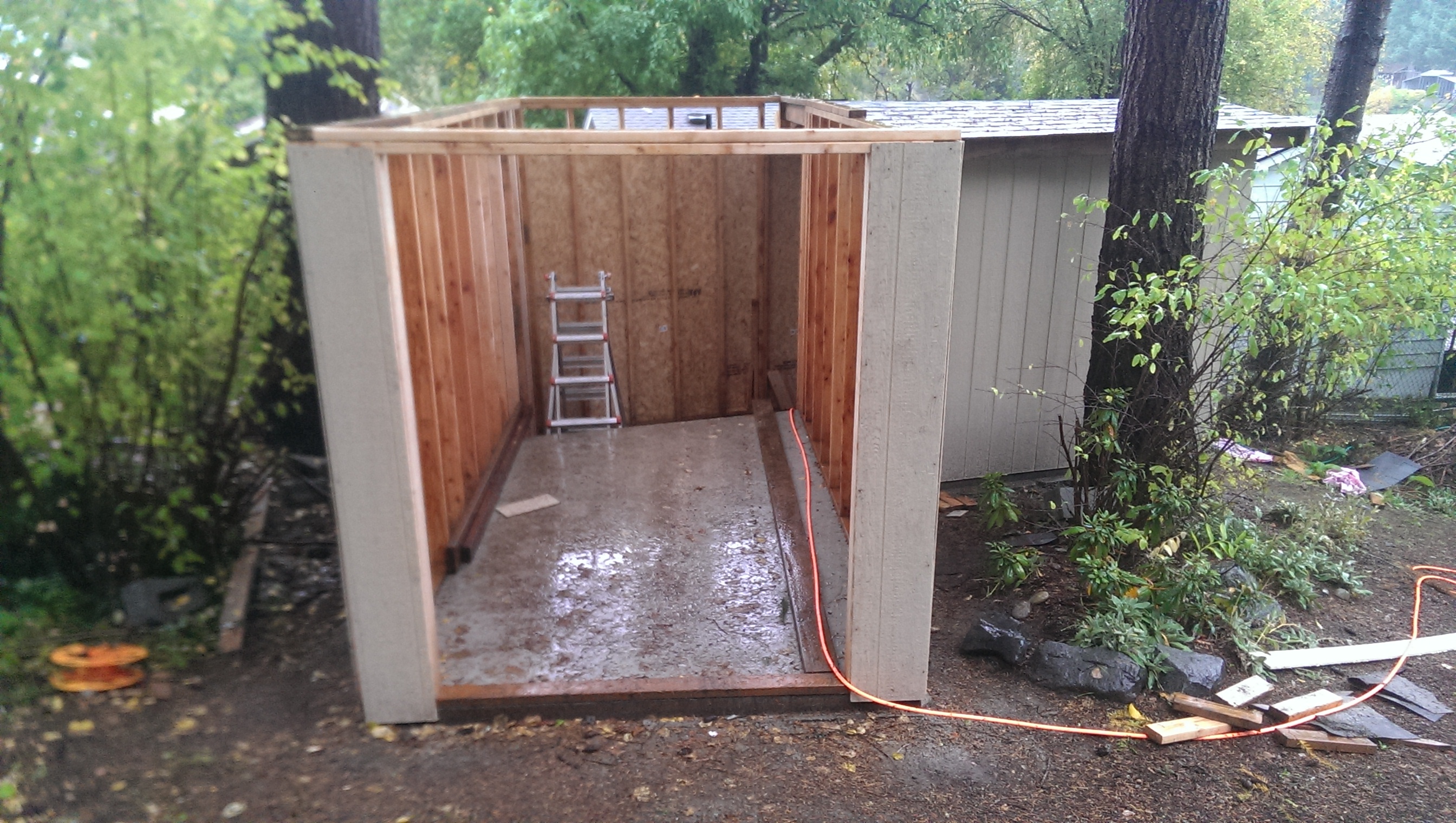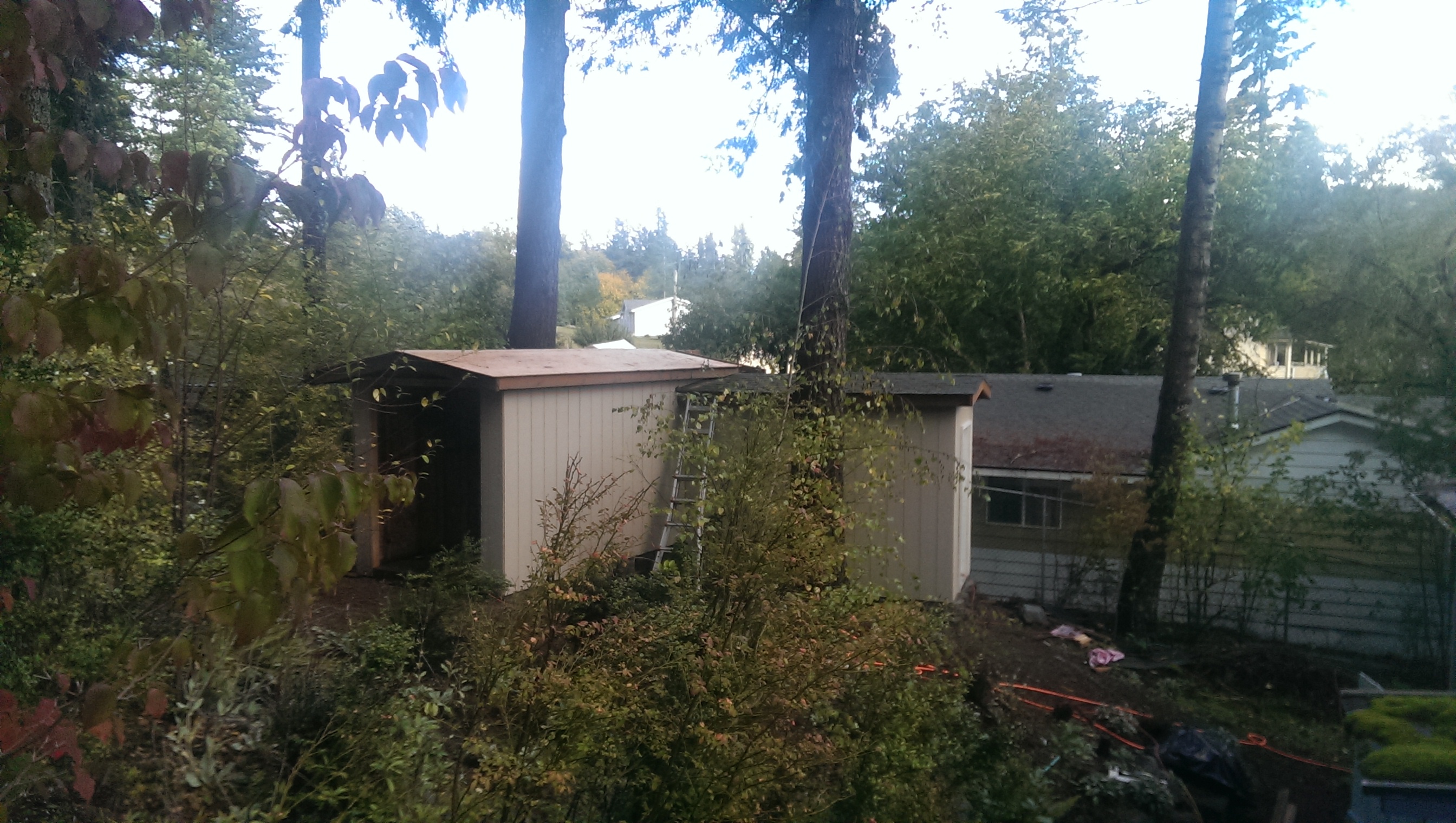 1.  The shed below is a 14 foot by 16 foot shed with half upper loft and covered storage for a small car or up to 4 cords of wood for the fire place.  Has a full concrete floor.