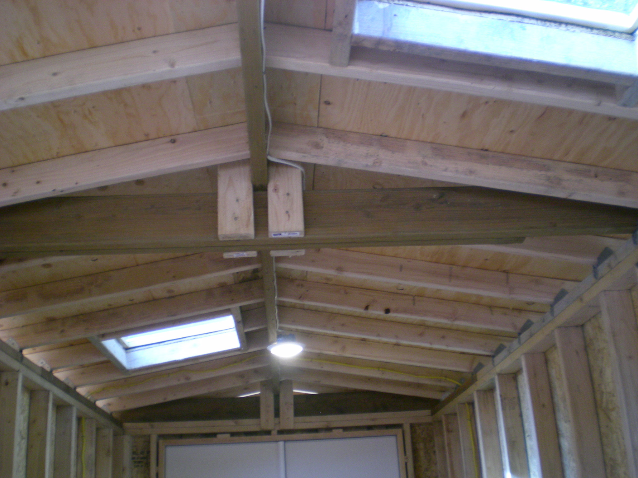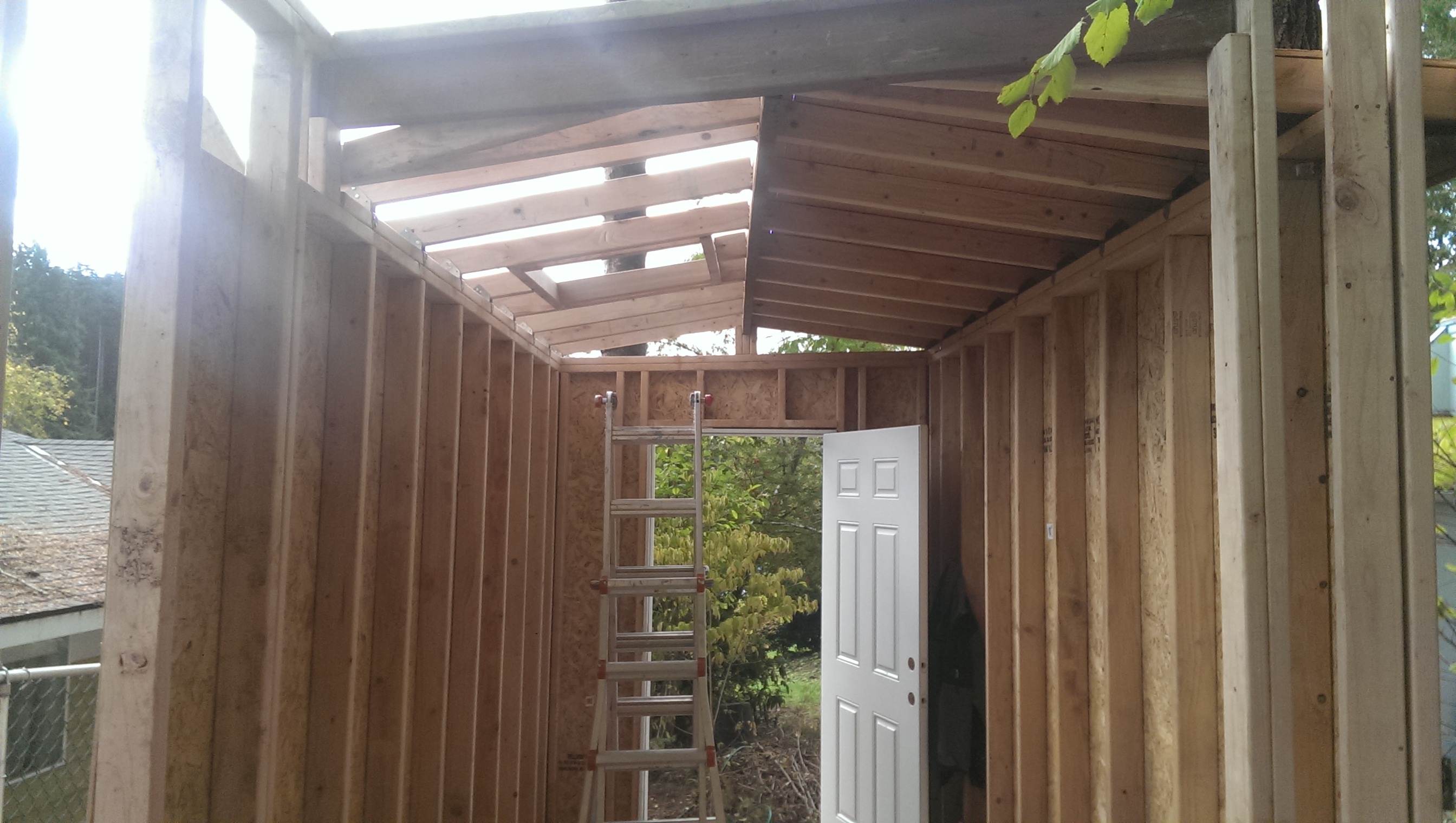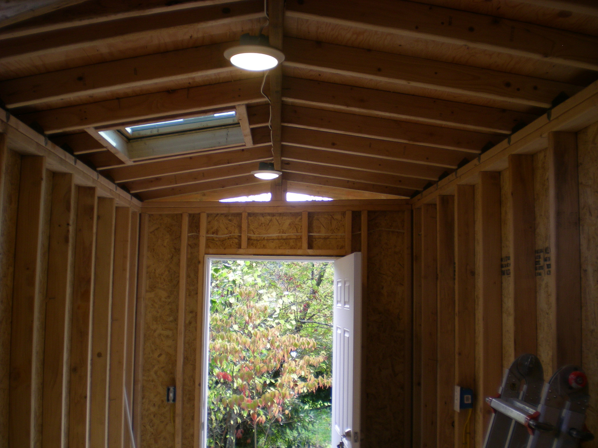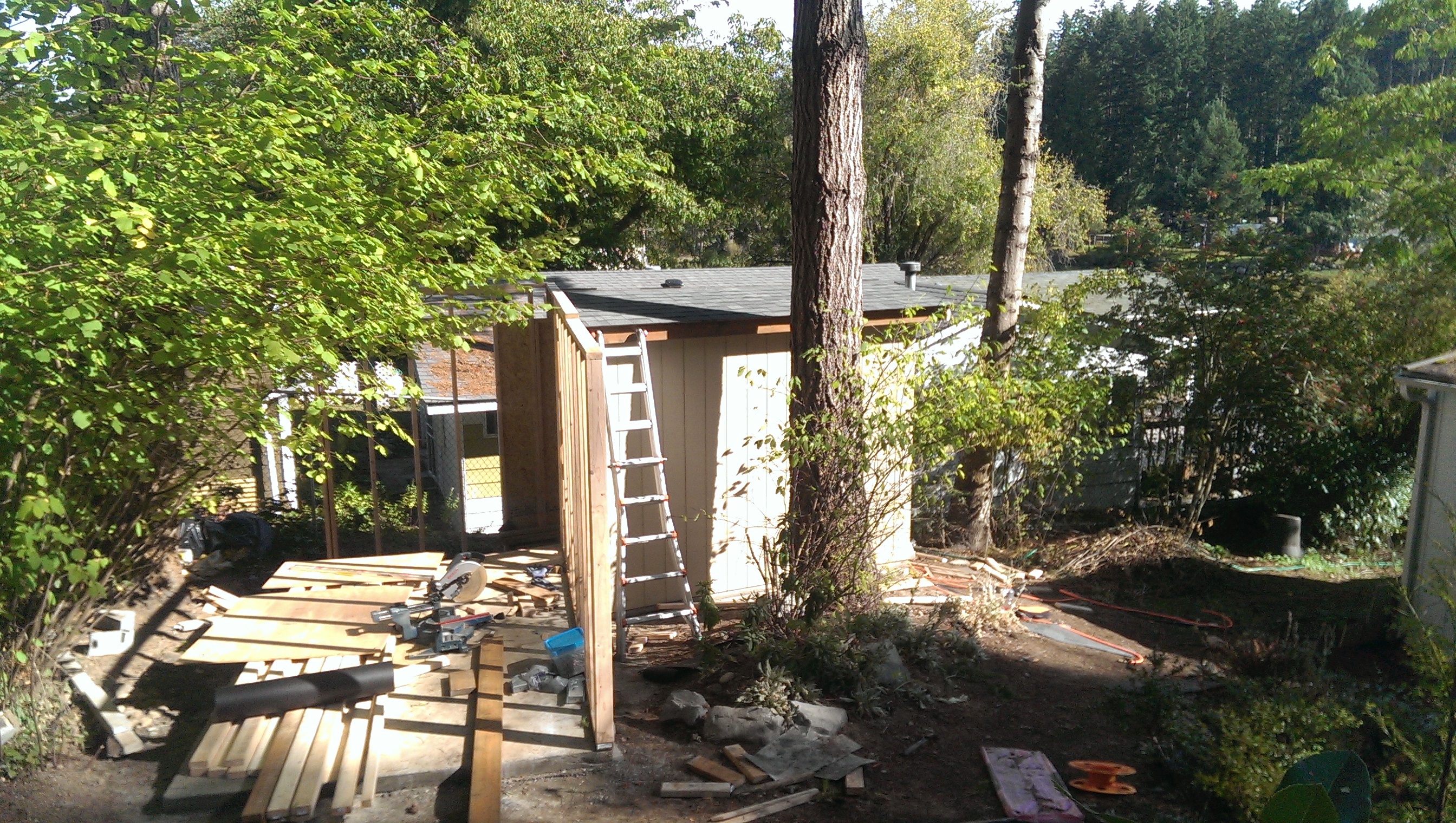1.  The shed below is a 14 foot by 16 foot shed with half upper loft and covered storage for a small car or up to 4 cords of wood for the fire place.  Has a full concrete floor.